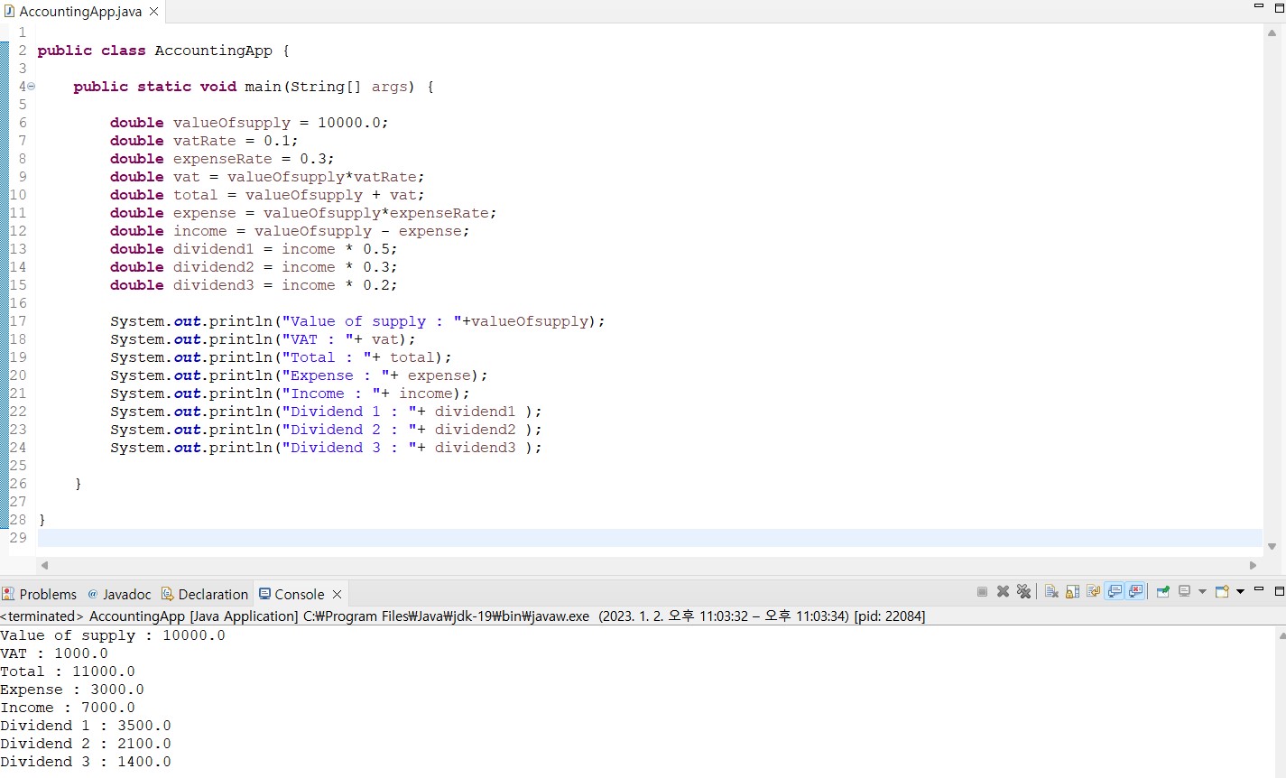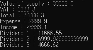 - 물건을 판매하는 사업을 하고 있다고 할 때, 각종 세금 및 비용을 제외한 이익을 동업자들에게 공평하게 나눠주는 작업을, 물건을 팔 때마다 해야 하는 상황에 있다고 할 때, 자바를 사용해서 해결한다면?