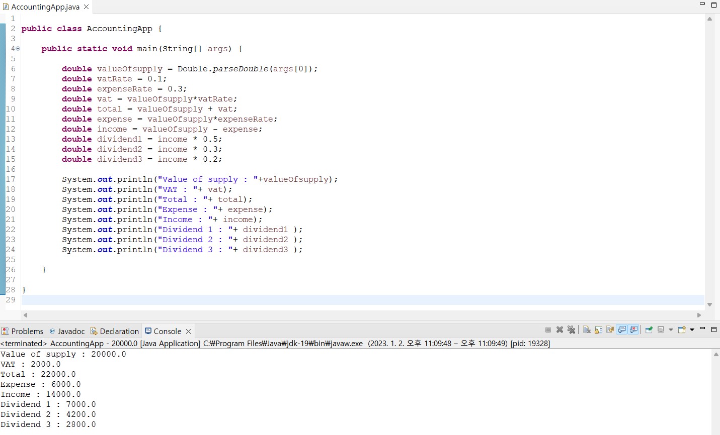 - run - run configurations - arguments - 입력값 입력 - name 변경 - string을 double에 맞게 데이터 타입을 바꿈(Double.parseDouble)